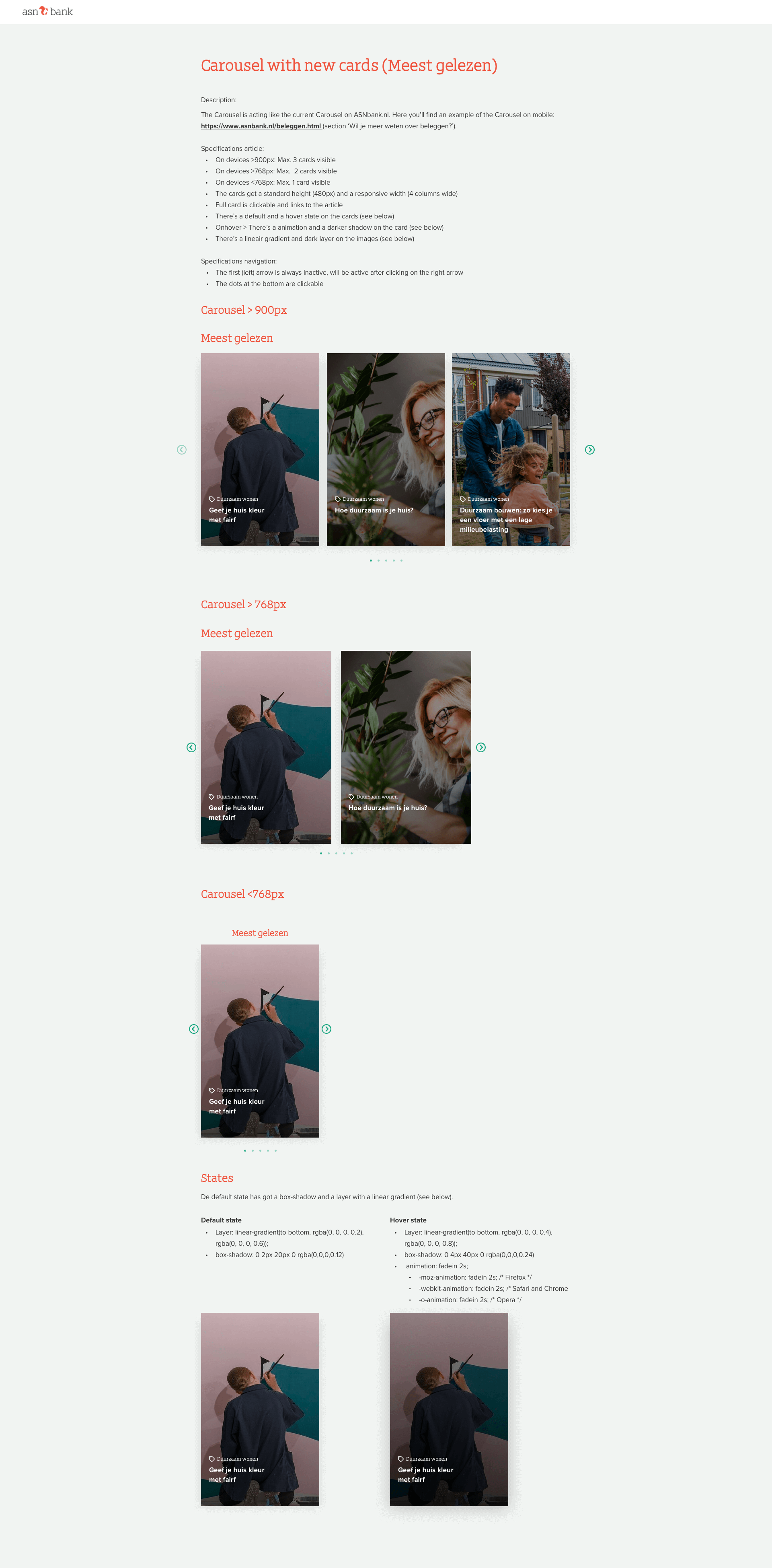 Tijdens de ontwerpfase heb ik 3 scenario’s uitgewerkt: van scenario A (minimale impact voor development) naar scenario C (maximale impact development). Uiteindelijk hebben we gezamenlijk gekozen voor scenario B, omdat dit paste op de backlog van het retail-team dat de designs uiteindelijk zou gaan ontwikkelen. De designs bestonden uit diverse ontwerpen van pagina’s, zoals de landingspagina en artikelpagina’s. Deze pagina’s heb ik voor diverse devices ontworpen (mobiel, tablet en desktop). Tijdens het ontwerpen hebben we als projectgroep met name nagedacht hoe we de gebruiker zoveel mogelijk konden inspireren. Daarbij hebben we componenten een nieuwe look & feel gegeven (de breadcrumbs, cards en hoofdnavigatie) of van scratch ontworpen (hero image, highlight block en full width image).