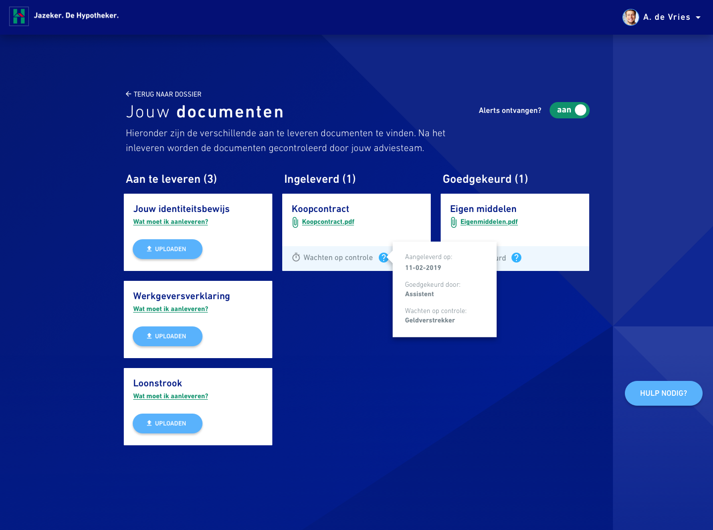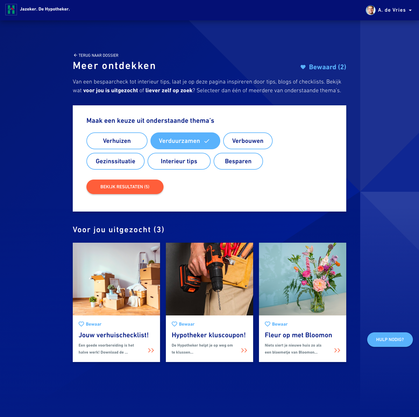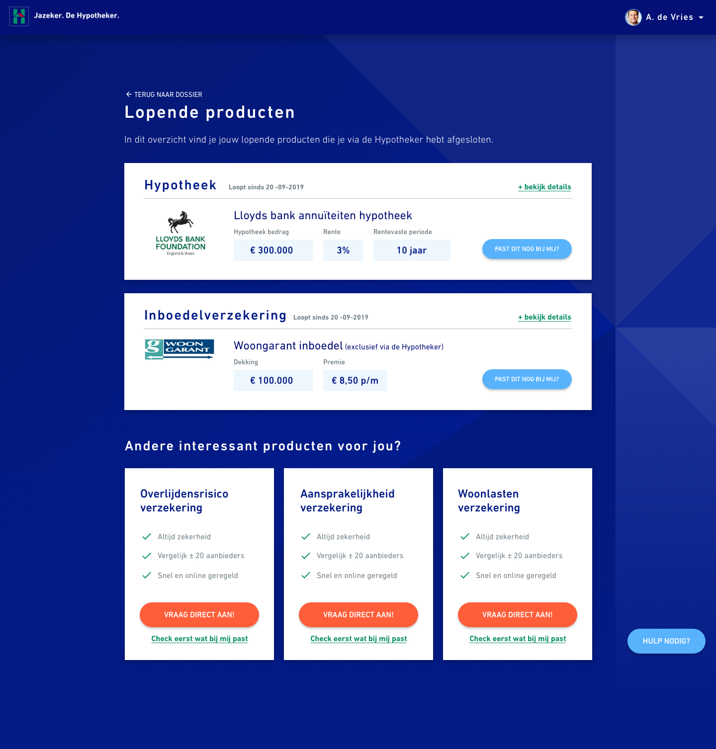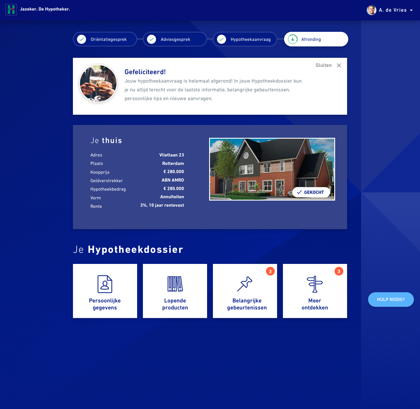 Voor dit concept hebben we gebruik gemaakt van de nieuwe huisstijl van De Hypotheker. We zijn begonnen met het ontwerpen van een low-fidelity concept (interaction design). Tijdens een van de workshops hebben we de groep met stakeholders mee laten denken met deze concepten. Het uiteindelijke concept hebben we vervolgens uitgewerkt in een high-fidelity prototype, dat later gebouwd zou worden en vervolgens getest onder de doelgroep. Een belangrijke vereiste was dat de gebruiker meegenomen moest worden in het hypotheekproces met duidelijke stappen.