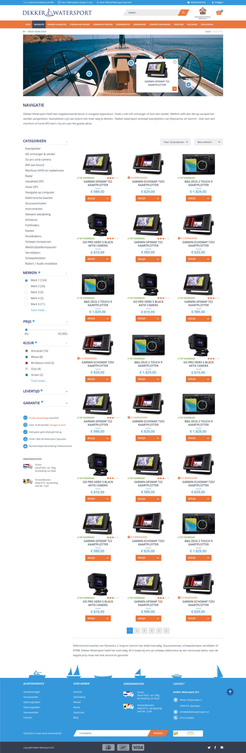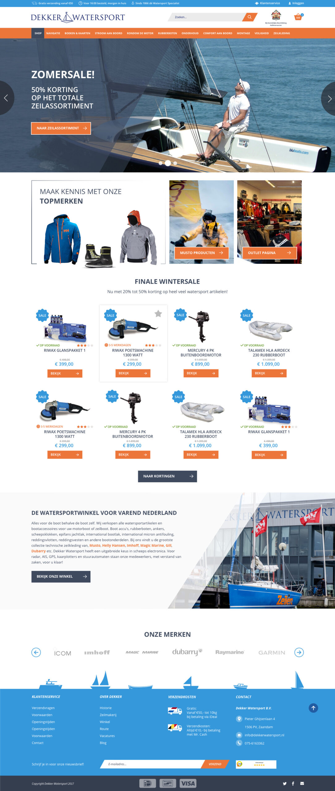 Dekker Watersport is een specialist in watersportartikelen. De watersportwinkel uit Zaandam is ruim 2500m2 groot en is al actief sinds 1866. Meerdere malen werd het bedrijf uitgeroepen als de grootste en beste watersportzaak van Nederland. Omdat het bedrijf een verouderde webshop had mocht ik in opdracht van CloudSuite een nieuw ontwerp maken van het platform, inclusief een nieuwe huisstijl.