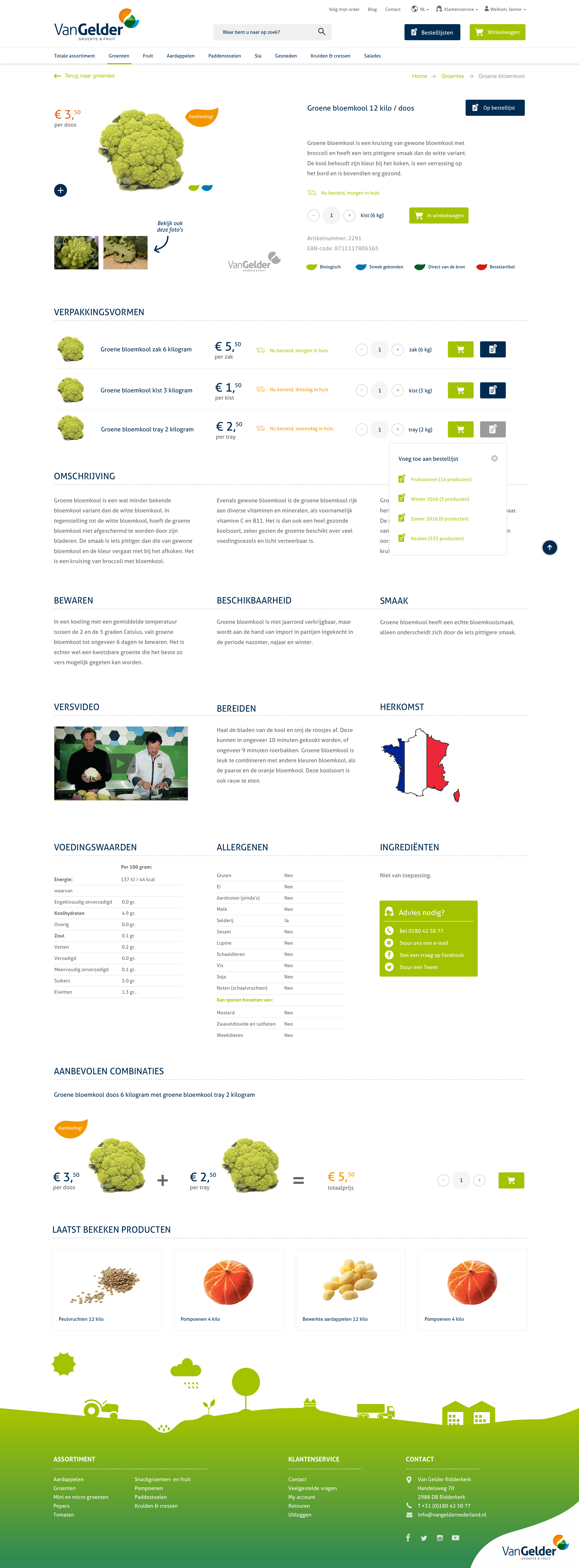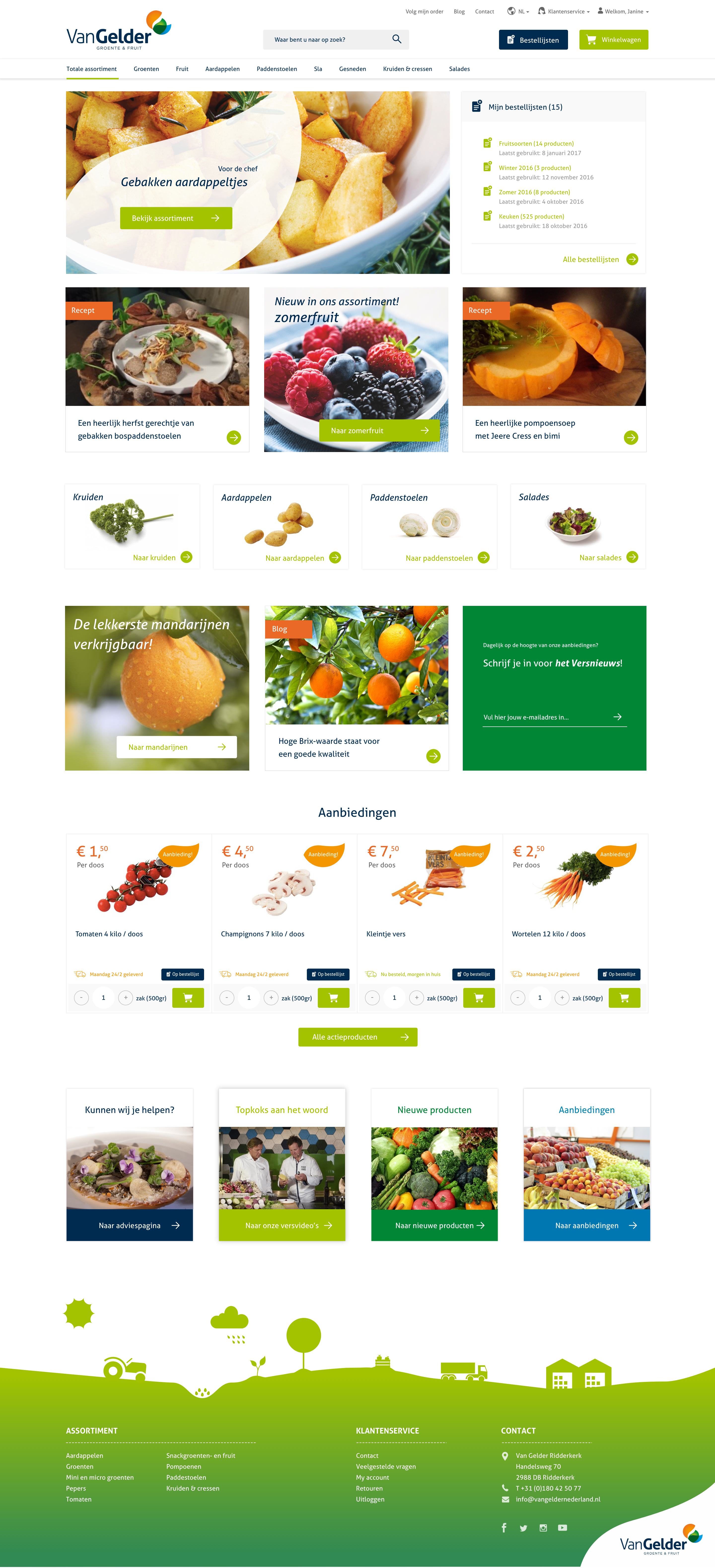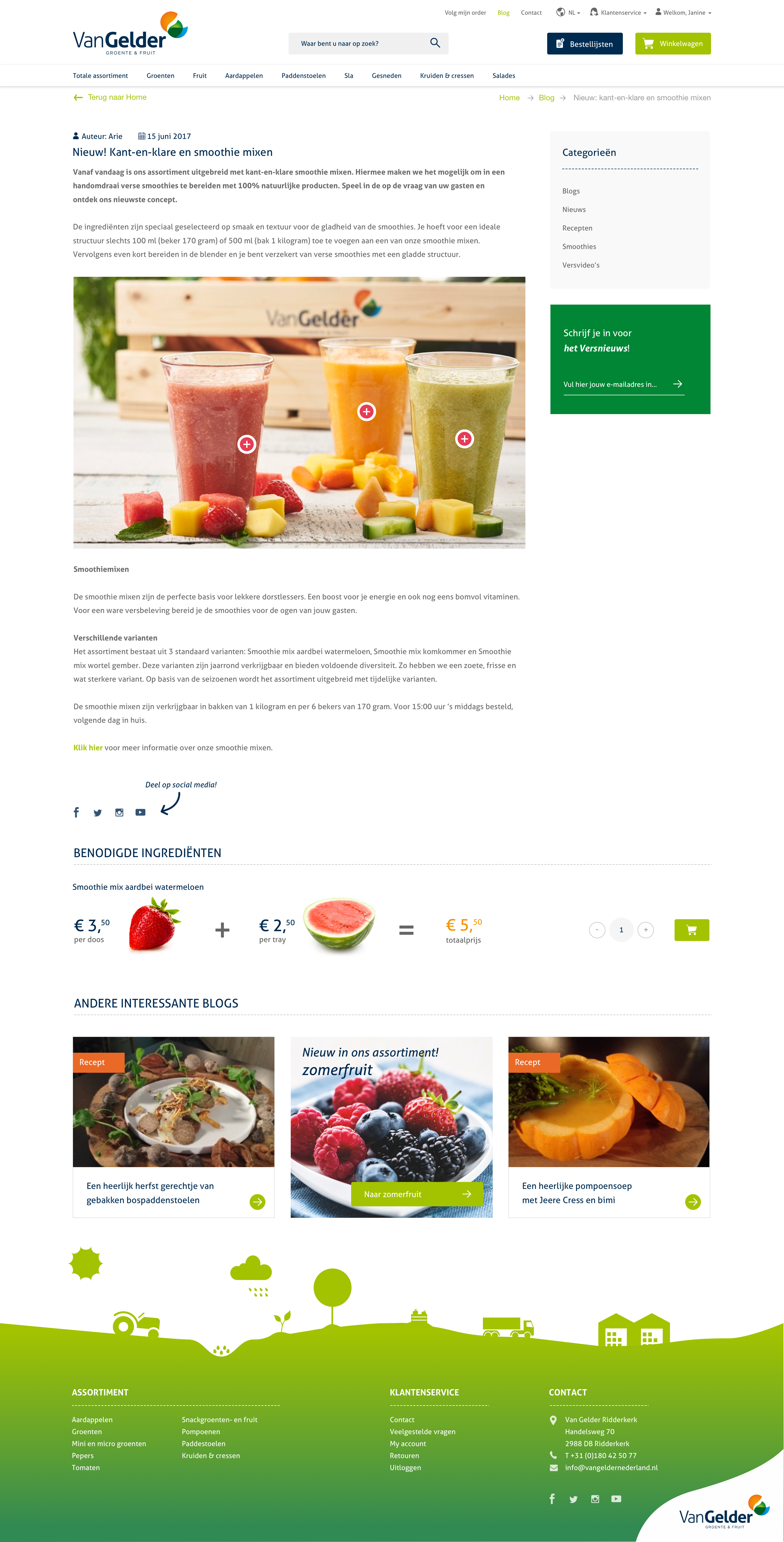 Allereerst was het leuk om uitgenodigd te worden bij Van Gelder zelf, om met eigen ogen te kunnen zien hoe er in de groothandel te werk wordt gegaan en hoe de groente en fruit wordt gedistribueerd. Vervolgens ben ik na een aantal creatieve sessies als UX designer aan de slag gegaan met het ontwerpen van de belangrijkste pagina’s zoals de homepage, productpagina’s, bestelpagina en blogpagina’s.