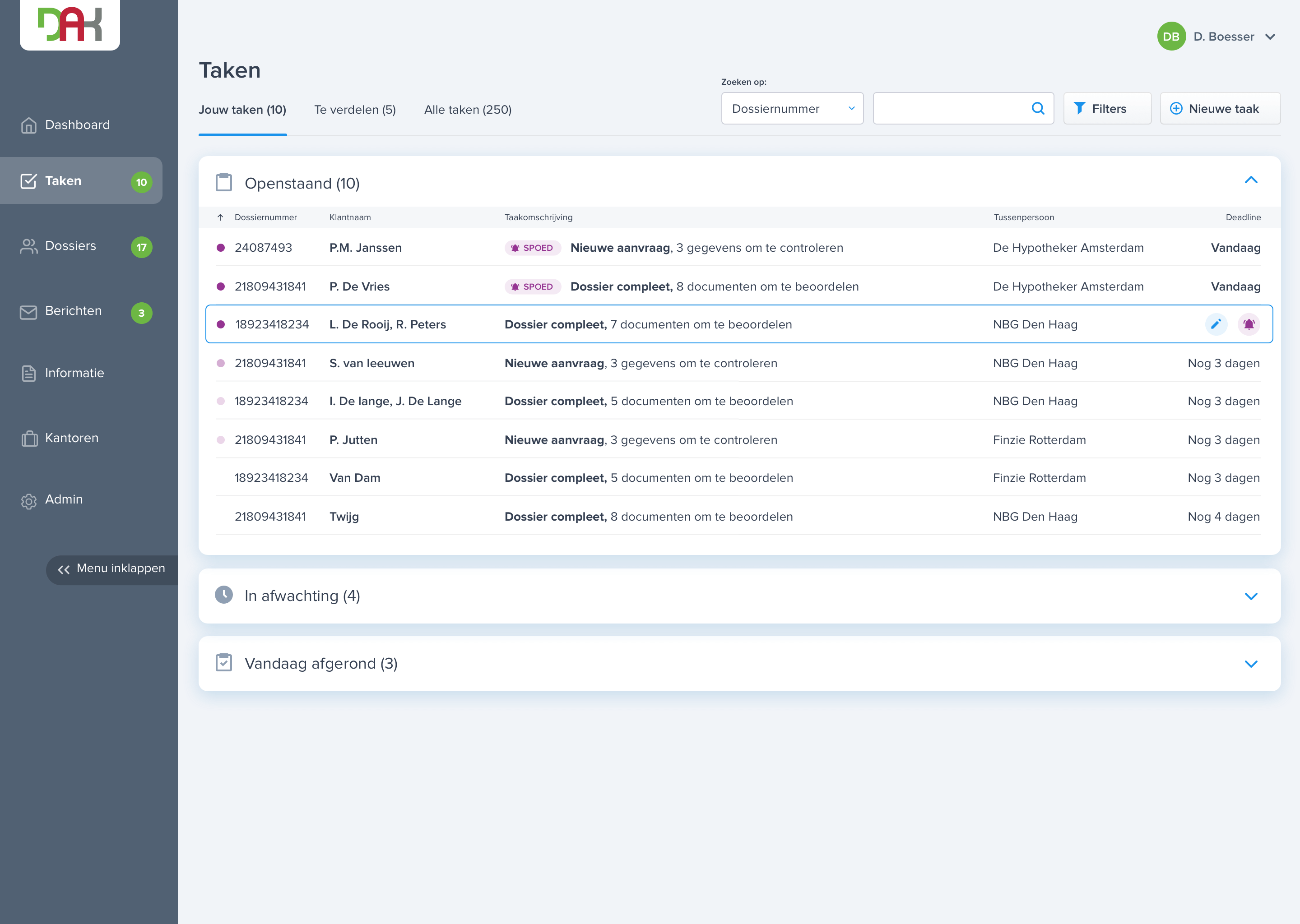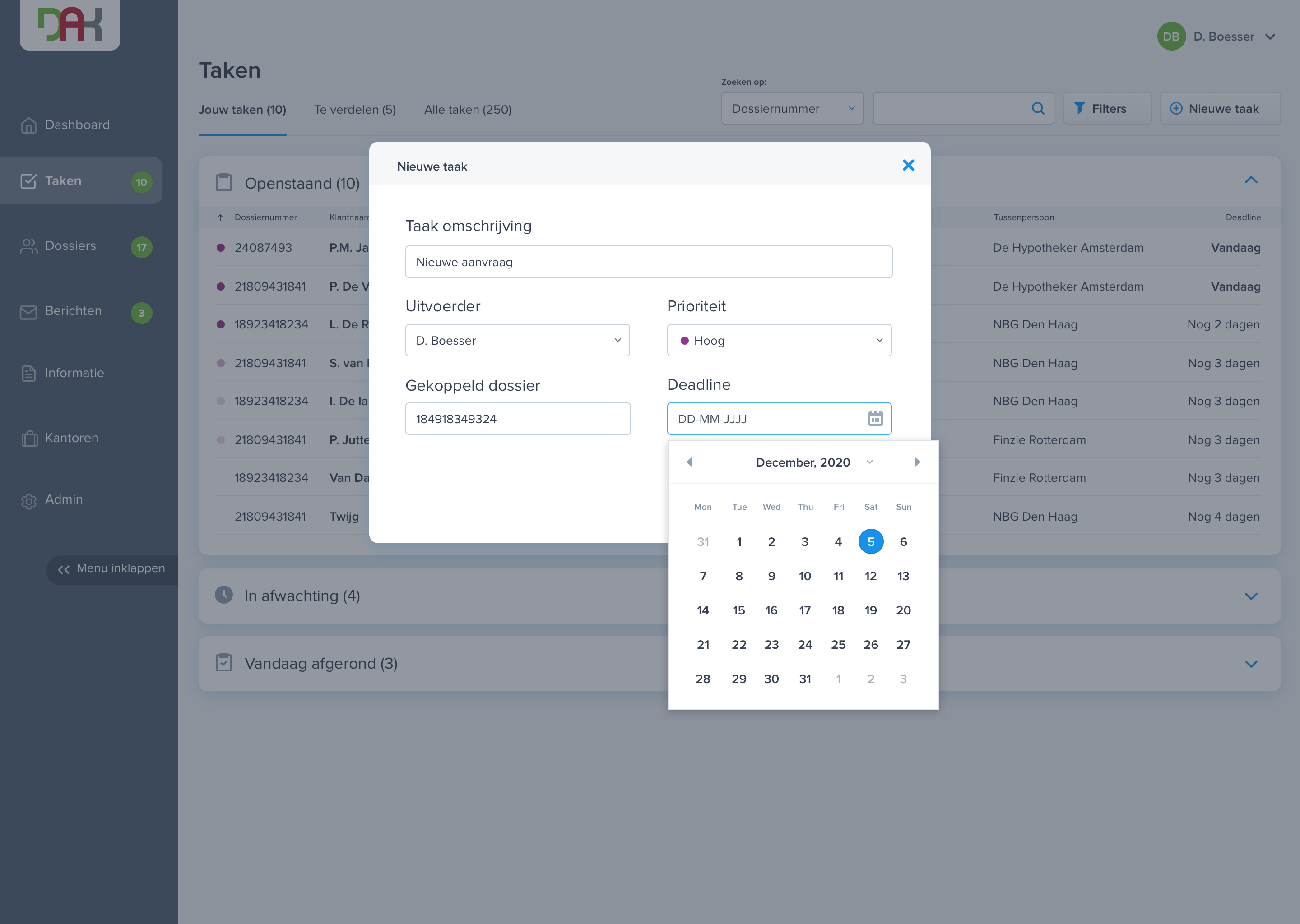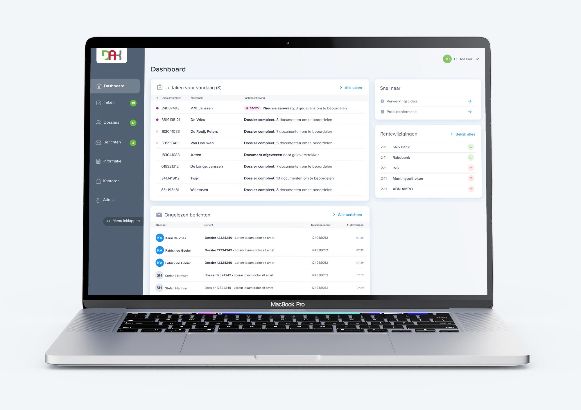 DAK Intermediairscollectief is een collectief van en voor 1500 onafhankelijk ondernemende adviseurs op het gebied van verzekeringen, hypotheken en kredieten. DAK heeft aan Yellowtail Conclusion gevraagd om een online hypotheekomgeving te ontwikkelen voor het sneller, makkelijker en vooral slimmer verwerken van hypotheekaanvragen. Het doel was om een complete tool neer te zetten die simpel in gebruik zou zijn en die alle functionaliteiten zou moeten bevatten die intermediairs en adviseurs nodig hebben bij het beheren van hun hypotheken. In deze case lees je hoe wij dat hebben aangepakt.