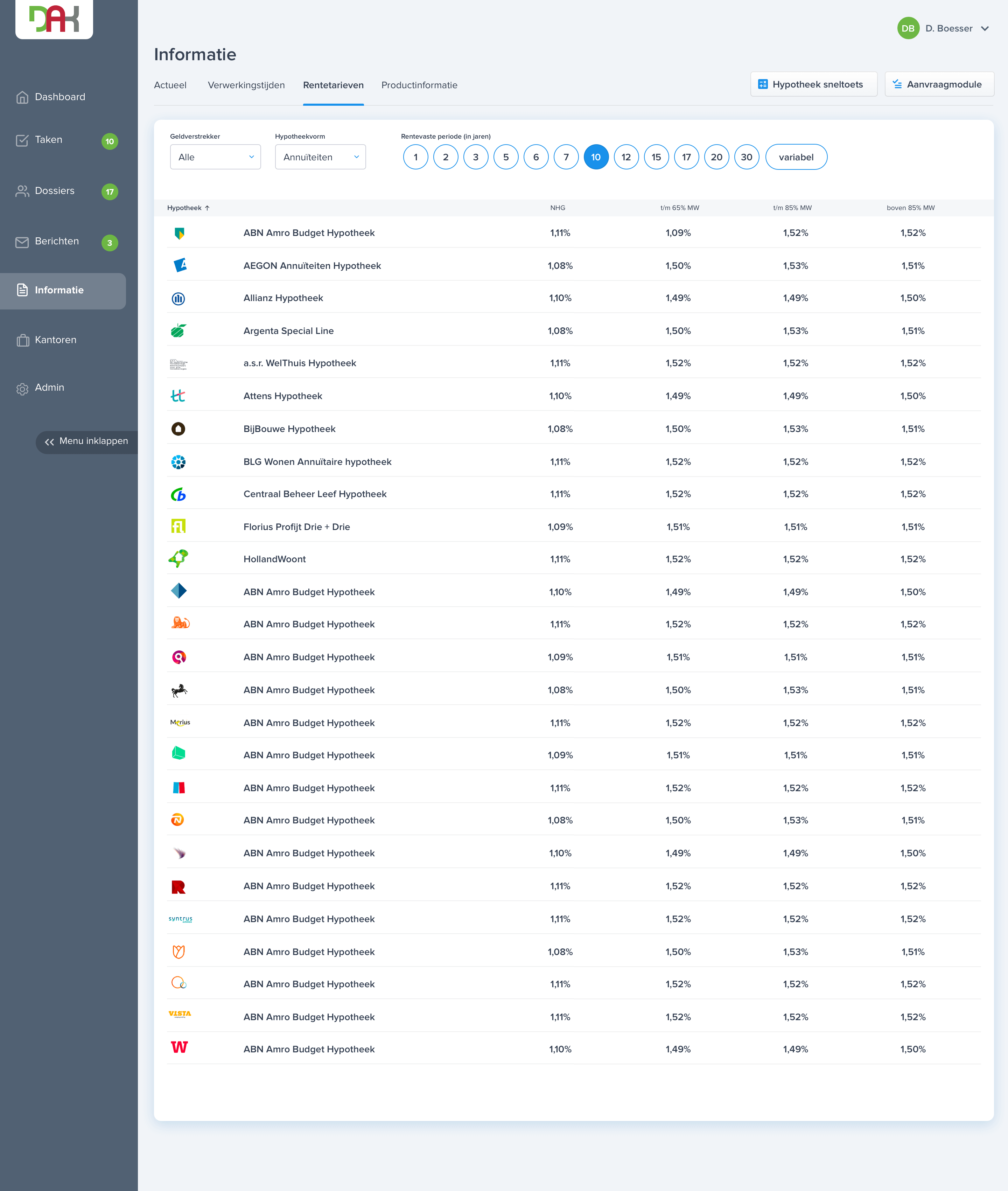Tijdens het ontwikkelen van het midoffice systeem is rekening gehouden met de wensen van zowel hypotheekadviseurs als hypotheekacceptanten. Samen met de adviseurs, de acceptanten en onze projectgroep hebben we gedurende een aantal maanden gewerkt aan het optimaliseren van de workflow. Aan de hand van een klantreis en expert-interviews hebben we met elkaar bepaald waar het product aan moet voldoen maar juist ook hoe ons product zich kan onderscheiden van bestaande software in de markt. Het intuïtieve gebruik van de software zorgt ervoor en adviseurs en acceptanten er snel en makkelijk mee uit de voeten kunnen. Dit heeft geresulteerd in een gebruiksvriendelijk en innovatief design.