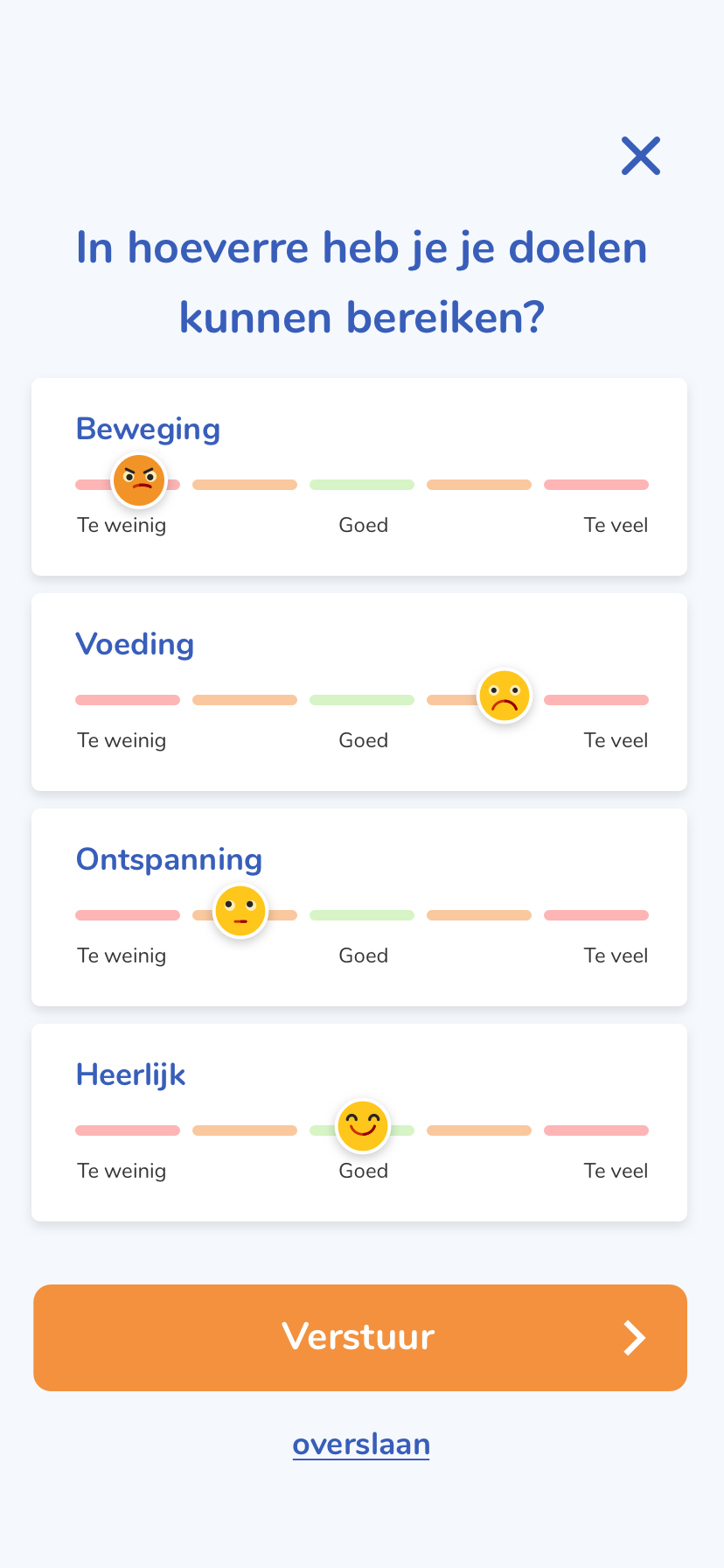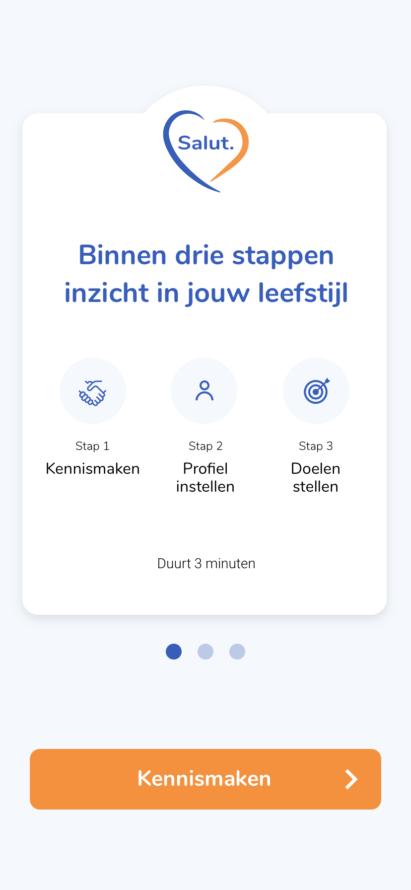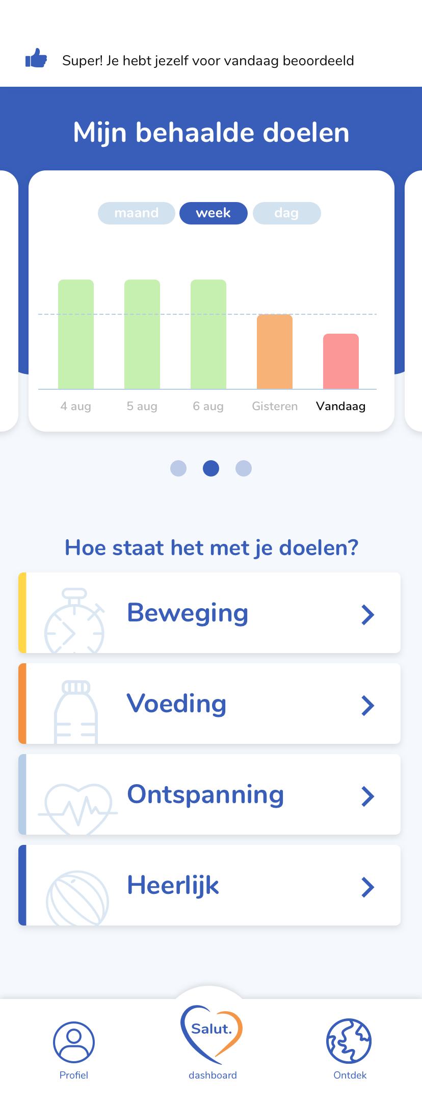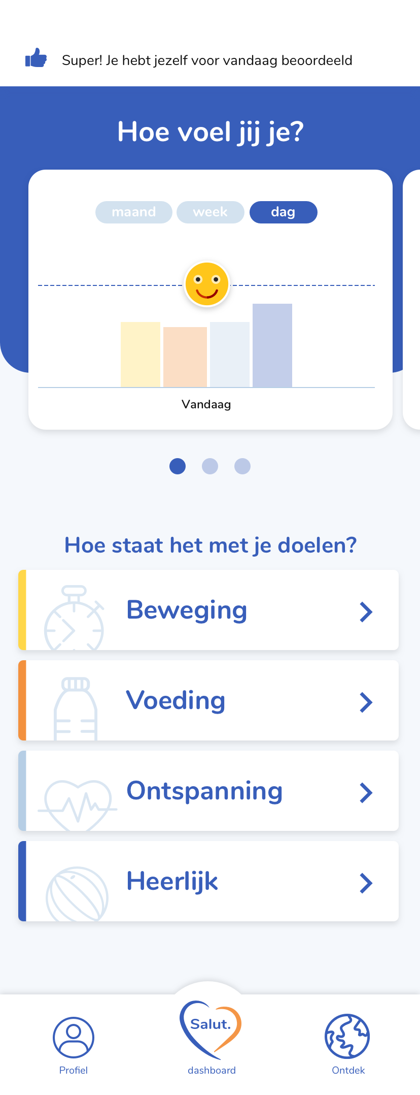 Voor dit concept heb ik gebruik gemaakt van de huisstijl van Salut. Tijdens een van de workshops hebben we de groep met stakeholders laten stemmen op een van de concepten. Dit winnende concept hebben we uitgewerkt in een high-fidelity prototype, dat later gebouwd zou worden en vervolgens getest onder de doelgroep. Inmiddels is de app te downloaden via de Appstore en de Google Play Store.